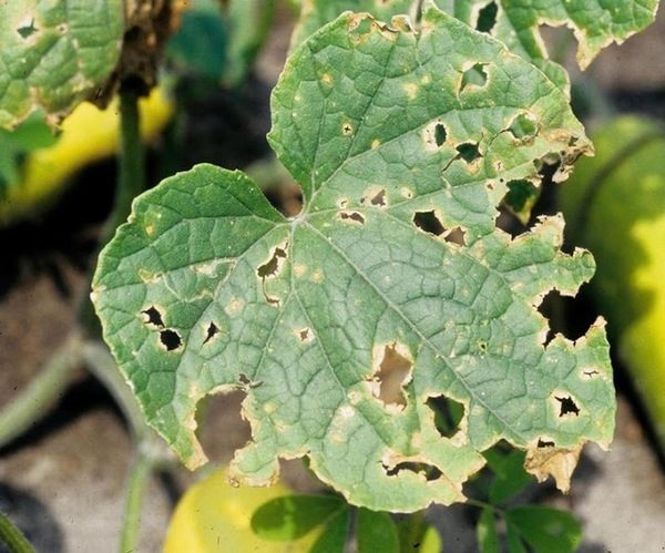 Verder langs de rand van de bladeren en langs de aderen worden gele of bruine vlekken getekend met een diameter van 5 mm tot 40 mm. Geleidelijk verspreidden ze zich naar de stengels. Ook is er een samenvoeging van witte vlekken op de komkommers en hun verlies. Hierdoor ontstaan gaten. Aangetaste stengels worden kwetsbaar. Op de groenten zelf kunnen langwerpige roze vlekken verschijnen, die tot een halve centimeter diep in de groente gaan. De aangetaste plant sterft.