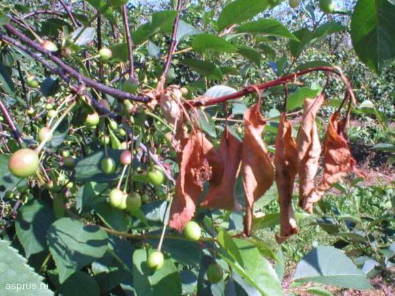 Als de kers al in augustus begint te vallen, is het tijd om de boom te genezen. De belangrijkste methode is het verwijderen van alle getroffen gebieden. In het voorjaar kan de ziekte worden voorkomen door het hout met Nitrfen te behandelen. Een boom spuiten met Bordeaux-vloeistof helpt ook de ziekte te bestrijden.