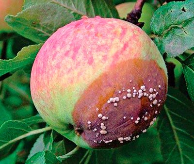 Appels hebben bruine vlekken die onaangenaam van vorm zijn. Ze groeien snel en beïnvloeden de hele foetus, daarom wordt het vlees ook bruin en kan het niet meer worden gegeten. Een aanzienlijk deel van de vrucht valt, hoewel velen aan de boom blijven.