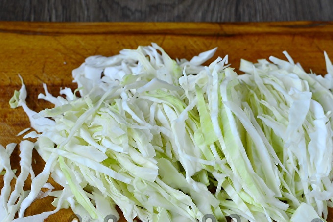 We kiezen voor volwassen, maar dichte groenten, zonder duidelijke gebreken. We wassen ze en maken ze schoon. We snijden witte kool in dunne plakjes.