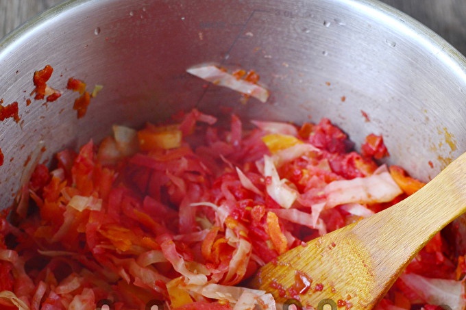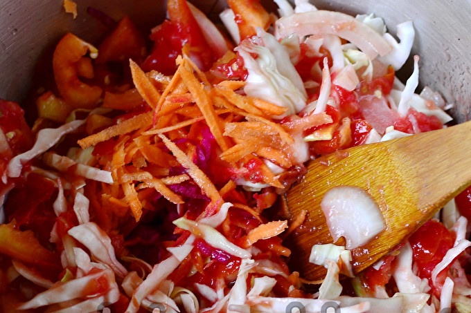 Giet vervolgens 70 ml plantaardige olie, 1,5 eetl. l. zout, 3 el. l. suiker. Kook de dressing nog 20 minuten en voeg dan een portie tafelazijn toe. Mix, laat een paar minuten sudderen en haal van het vuur.