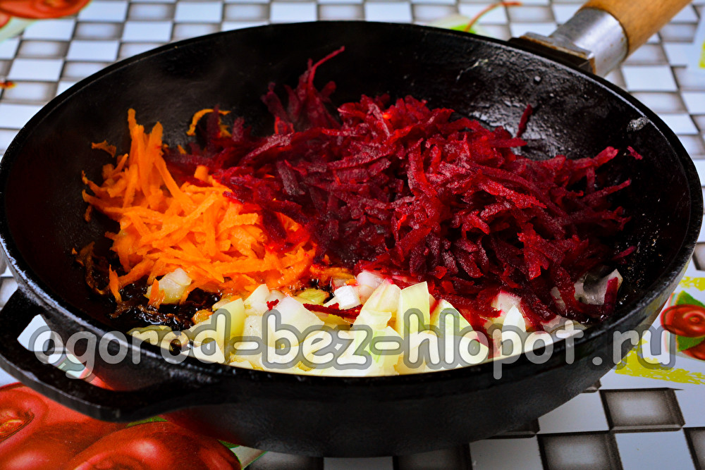 Hak intussen de groenten: hak de ui in blokjes en rasp de wortels met bieten op een grove rasp. Bak groenten in plantaardige olie.