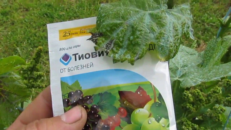 Na de bloei wordt de wijnstok bespoten met chemicaliën en folkremedies. Bijvoorbeeld, 50 g zuiveringszout wordt opgelost in 10 l water. U kunt een beetje vloeibare zeep toevoegen - 15 g. Van de chemicaliën is "Tiovit Jet" geschikt. Om het te bereiden, wordt 50 g van de stof verdund in water (3 l), grondig geroerd en het volume water wordt ingesteld op 10 l. De tool helpt om oidium en alle soorten teken te verwijderen.