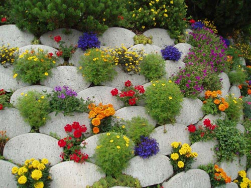 Als er een rivier in de buurt is en je kunt er ronde keien op vinden - je kunt zo'n semi-verticaal bloembed maken door verschillende bloemen tussen de kiezelstenen te planten - hoe leuk je muur is om te spelen, die je moest verbergen, of een deel van de tuin dat scheiding van de hoofdruimte vereist.