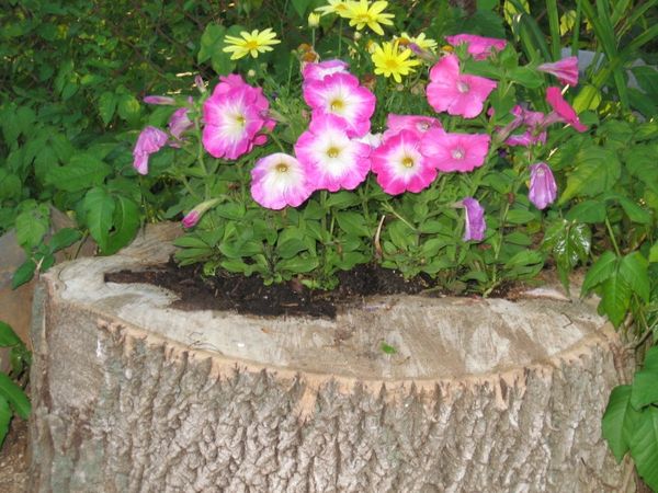 Een enorme stronk neemt een plaats in op de site en haalt het op geen enkele manier uit de weg? Wees niet verdrietig - vind hem een gebruik. Snijd een uitsparing erin, bestrooi met vruchtbare grond en plant mooie bloemen. En hoe je oude stronk zal schitteren, hoe jonger het zal zijn, hoe bloemen erop geplant zullen vrolijk schitteren met kleuren!