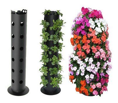Je kunt speciale containers kopen in de tuinwinkel, wat in feite plastic potten zijn die in elkaar worden geplaatst. geassembleerd als een stele, en plant bloemen erin. Dit zal resulteren in zo'n mooi bloemen verticaal bloembed dat de ogen van alle voorbijgangers trekt.