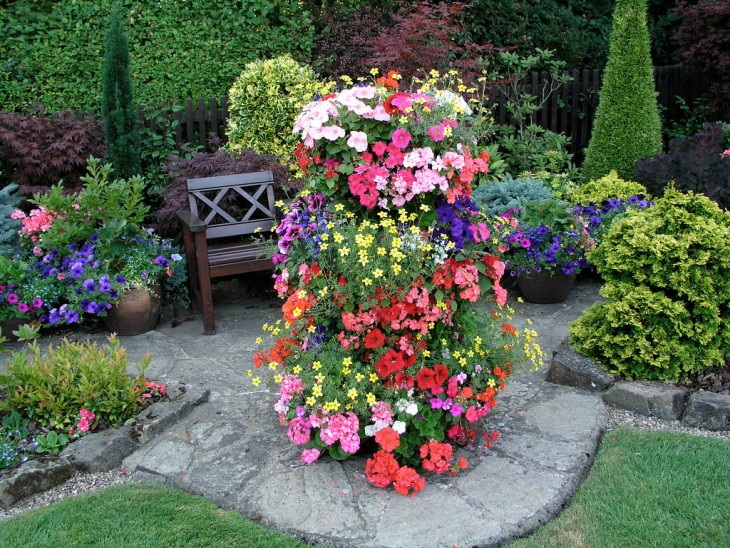 Verticale bloembedden zijn niet alleen een spectaculair gezicht, maar besparen ook ruimte in de tuin. Voer ze uit in de vorm van bogen, dia's, hangende structuren, kolommen, piramides. De betekenis van dergelijke ontwerpen is om een frame, een irrigatiesysteem en het fixeren van de grond te maken.