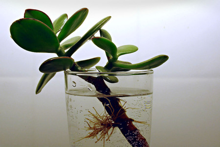 Om in water te wortelen, verwijdert u de bladeren aan de onderkant van de bladsteel en plaatst u deze in een bak met water zodat deze niet volledig zinkt. Het is raadzaam om Cornevin (een wortelstimulator) of houtskool aan het water toe te voegen. Direct zonlicht mag niet op de steel vallen. Na 2-3 weken heeft hij wortels, wat betekent dat je in een pot kunt planten.