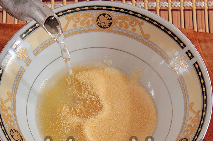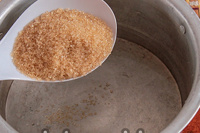 Giet een halve liter water in de pan. Giet bruine suiker en zet op een fornuis op hoog vuur. Roeren, enkele minuten koken, suiker oplossen.