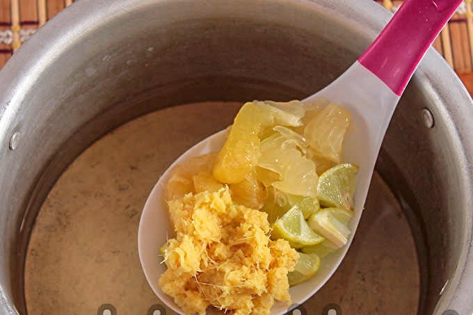 Voeg gehakte gember toe (hak de wortel of drie fijn door een rasp), limoenen, citroen. Kook 10-12 minuten al roerend.