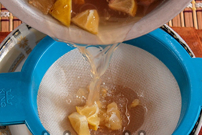 We filteren de geurige bouillon door een zeef, we hebben alleen vloeistof nodig, gooien de rest eruit.