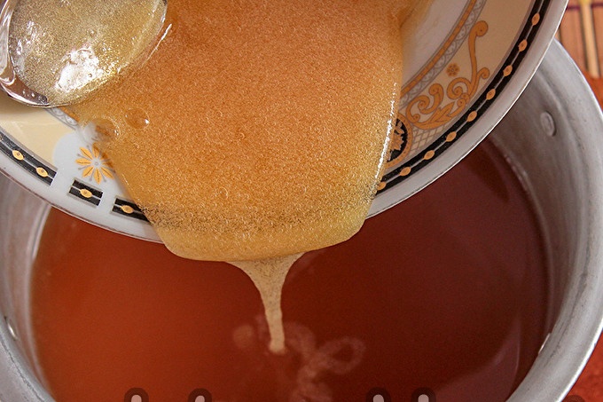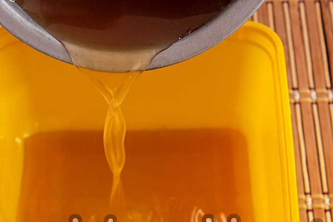 Week de agar-agar in een afzonderlijke kom. Giet in een poeder van 100 ml. heet water, los op en laat vijf minuten staan. De consistentie van de oplossing zal een zeer dikke siroop blijken te zijn.