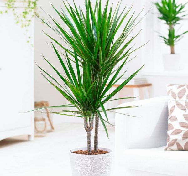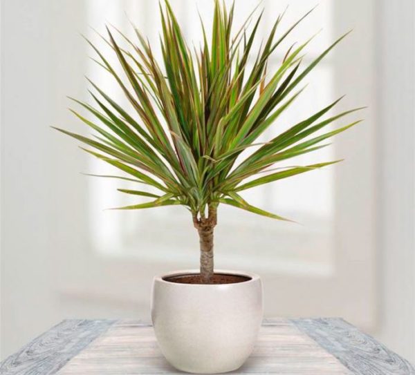 Het lijkt op de vorm van een boom en heeft lange smalle bladeren die zo zijn gerangschikt dat ze op warrig haar lijken. Omzoomde dracaena-bladeren vertrekken vanuit het midden als ze vallen; de plaats ziet eruit als een ongewoon en mooi ornament.
