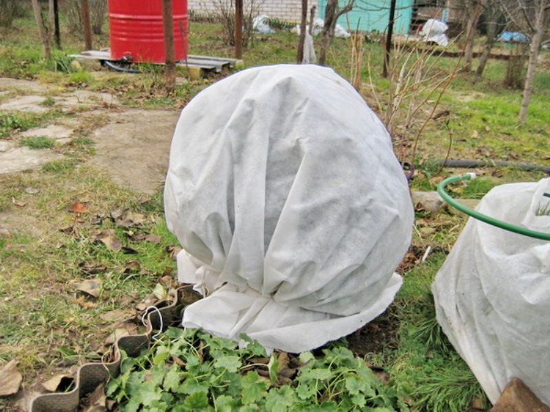 - Wanneer de sneeuw valt, gooien ze het over een overdekte struik. Een dergelijke extra isolatie beschermt tegen de schadelijke effecten van kou.