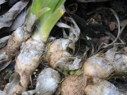 De gegraven bollen moeten worden behandeld met een zwakke oplossing van mangaan, vervolgens 2-3 weken worden gedroogd en in een geventileerde ruimte worden bewaard.
