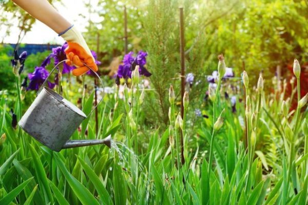 Het is vooral belangrijk om de bewatering van de plant te controleren tijdens hun snelle groei, dat wil zeggen wanneer de knoppen beginnen te vormen en bloeien. Zodra de iris vervaagt, kan het water worden gestopt, omdat de plant rust nodig heeft.