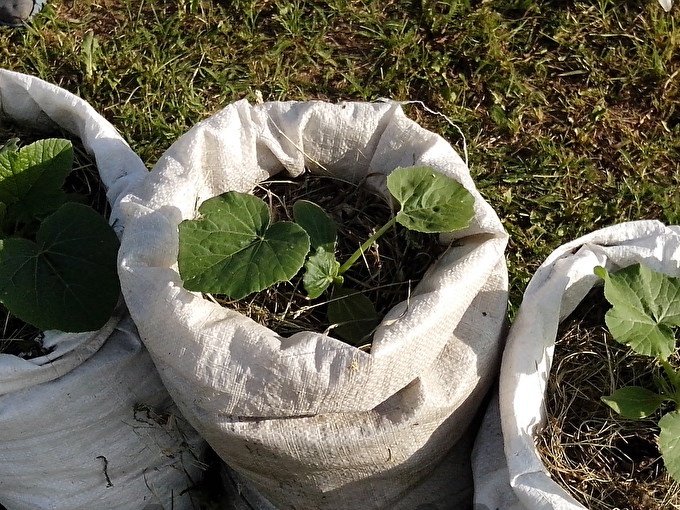 Zo'n tas is erg praktisch. Het kan overal worden geplaatst: op bedden, in het gras, in de buurt van kassen. Ik geef de voorkeur aan goed verlichte plaatsen, want hoe snel het fruit rijpt en wat het smaakt, hangt ervan af. En de courgette in de zak groeit veel sneller. Waarom? Omdat de wortels van planten comfortabel zijn vanwege de hitte die vrijkomt tijdens het verval van organische resten. Bovendien liggen de vruchten bovenop de zak zonder de grond te raken, wat u een mooie en hoogwaardige vrucht zonder gebreken garandeert. En tegen de herfst zullen plantenresten vergaan en krijg je een soort compostzak, die dan op ruggen kan worden verspreid.