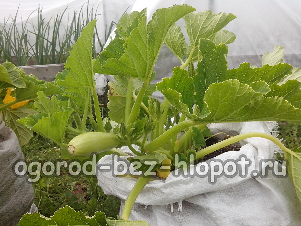 Nadat onze tas klaar is, kun je beginnen met het planten van zaailingen of zaden van courgette, die overvloedig water moeten krijgen, en als het buiten koel is, dek je af met een plastic fles met een open nek in twee delen gesneden. En na het planten, gebruikelijke verzorging, topdressing en water geven.