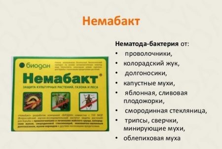 De naam van het medicijn bestaat uit de woorden Nematode en Bacterium. Bij gebruik van dit hulpmiddel vernietigen de larven van de coloradokever een speciaal gefokte nematoden microscopische worm. De nematode komt het lichaam van de larve binnen, eet het ongedierte van binnenuit, vermenigvuldigt zich snel en zoekt het volgende slachtoffer. De nematoden die naar de site zijn gebracht, maken hem actief schoon gedurende twee tot drie jaar; voor de winter gaan ze de grond in en overwinteren, zodat ze in het voorjaar, nadat ze zijn geïntensiveerd, weer beginnen met het reinigen van de plaats van de larven van de coloradokever. Nematoden worden gekweekt in een biologisch laboratorium, aangebracht op schuimrubber en verpakt in zakken. Bewaar het medicijn in een koelkast bij een temperatuur van twee tot acht graden Celsius.