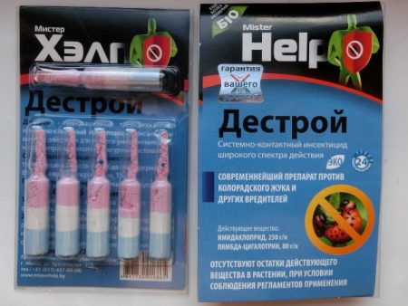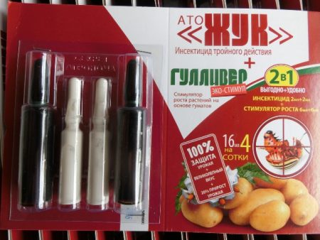 Actieve ingrediënten alpha-cypermethrin, lambda en thiamethoxam. Het medicijn is verkrijgbaar in ampullen (3 ml.). Pesticiden komen via voedsel in het lichaam van insecten terecht. Elk van de stoffen werkt op het zenuwstelsel, waardoor het gegarandeerd wordt uitgeschakeld. Insecten beginnen krampen, verlamming en vervolgens de dood. Ook dient dit medicijn als een stimulator van de aardappelgroei. Het medicijn is 20 dagen geldig vanaf de behandelingsdatum. Voor het verwerken van 100 m². plot verdunde 1/2 ampullen van het medicijn in 5 liter. water. Herhaal indien nodig de behandeling.