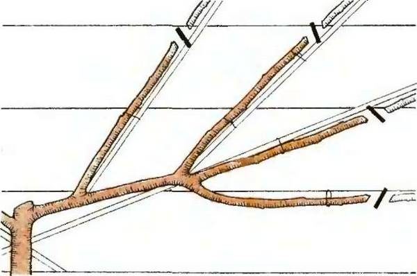 Het inkorten van de scheuten met het doel een kroon te vormen, gebeurt al in het eerste levensjaar van tuingewassen. Algemeen schema voor het snoeien van tuinbomen Het ziet er zo uit: laat 6 of 7 sterke takken achter. De afstand tussen hen is 30 tot 40 cm.