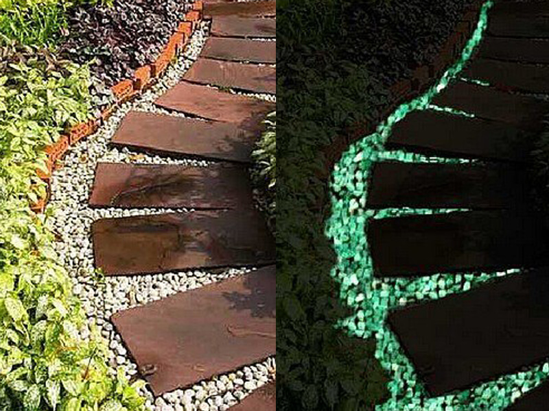 Stijlvol gedecoreerde veelkleurige kiezelstenen langs tuinpaden, in de buurt van een vijver of banken. Iriserende contouren van banken en lichtgevende straatbloempotten zijn een originele manier om een aangrenzend huis te versieren.Fluorescerend of fosfor gebruiken is heel eenvoudig. Als resultaat kunt u een zachte nachtgloed krijgen, die aangenaam is voor de ogen, terwijl de harmonie van de schemering niet wordt verbroken.