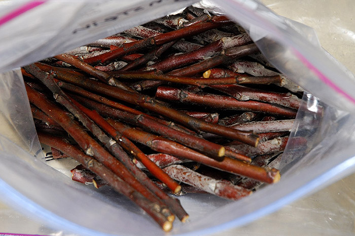 Scion stekken worden ook voorbereid in de herfst, vóór het begin van de eerste vorst. Ze worden gesneden uit de bovenste scheuten van bomen van een geschikte variëteit. Stekken worden gemaakt met een lengte van 10-15 cm met 2-3 levende nieren. Als het gepland is om verschillende variëteiten of variëteiten te vaccineren, worden scions verzameld in afzonderlijke bundels en wordt een tag met de naam bijgevoegd.