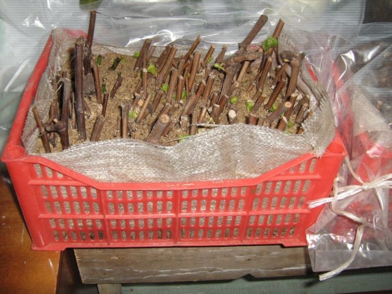 Voordat met het werk wordt begonnen, worden de stekken in een doos met bevochtigd zand geplaatst in een verticale of licht hellende positie, waardoor het onderste deel met een derde wordt verdiept. Een andere opslagoptie is om de stekken in een film en stropdas te plaatsen. Scions worden samen met voorraden in de kelder of in de kelder bewaard.