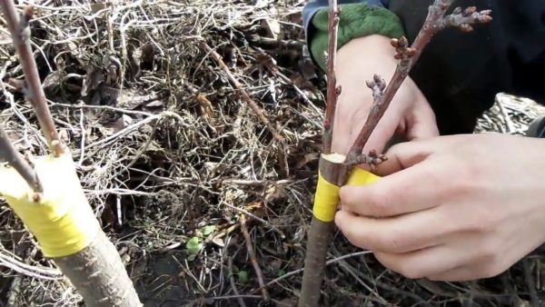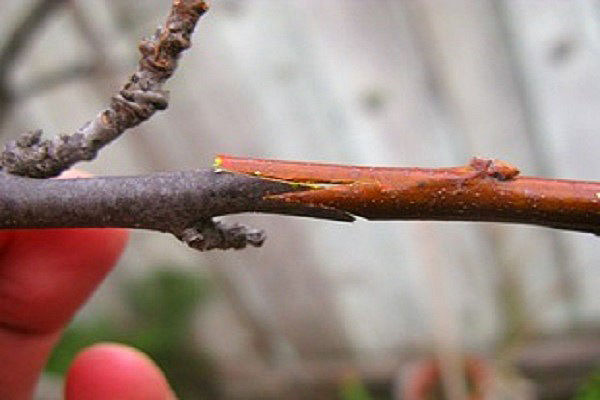 Als de scheiding van de cortex niet goed genoeg is, wordt de vaccinatie in een split uitgevoerd. Een incisie wordt gemaakt in het midden van de onderstam en een stengel wordt erin gestoken met een schuine snede, waarbij de lagen van de schors worden gecombineerd. Draai vervolgens de randen van de spalk stevig vast met tape en bedek de plaats van inenting met tuinvar.