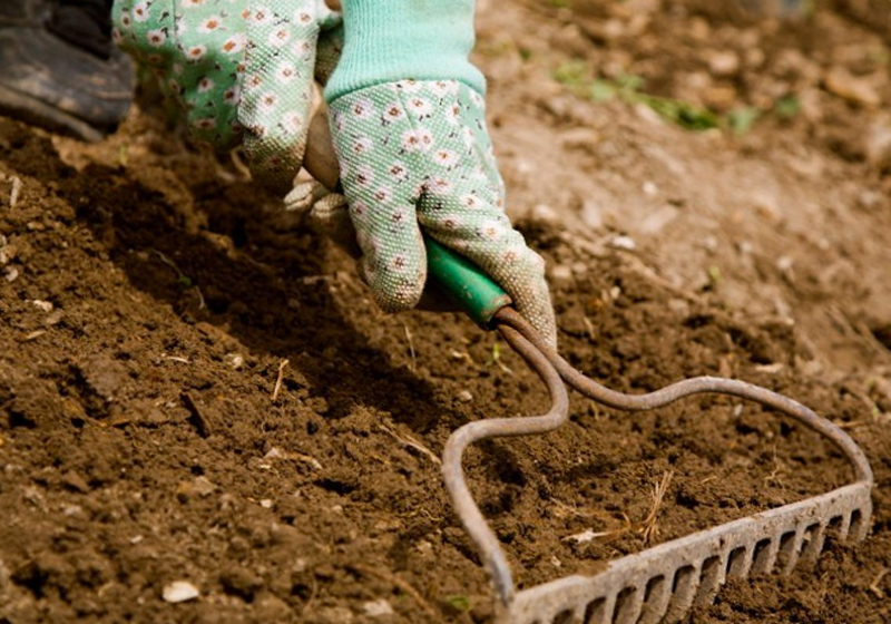 Het bevrijde land wordt geëgaliseerd met een hark en de zaden van groene mest worden erop verspreid.