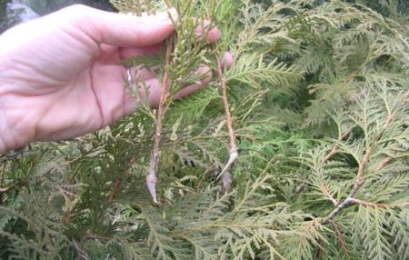 Ik snijd de takken van thujatakken in de lente. Ik neem grotere stekken (tot 20 cm) en altijd met een hak. Ik leg ze in een container onder de film. Tegen de herfst vormen ze goede wortels, ik transplanteer ze in de tuin. Ik gebruik geen stimulerende middelen, er zijn geen problemen met rooten.