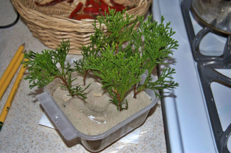 De tweede helft van het weefsel wordt bovenop het sphagnum geplaatst. Het bovenste gedeelte van de stekken met naalden moet zich bovenaan bevinden. Het canvas wordt gevouwen. Het blijkt geen strakke rol te zijn. Het wordt in een doorzichtige plastic zak geplaatst. Ze hangen het in een lichte, redelijk warme kamer en wachten tot de wortels verschijnen.