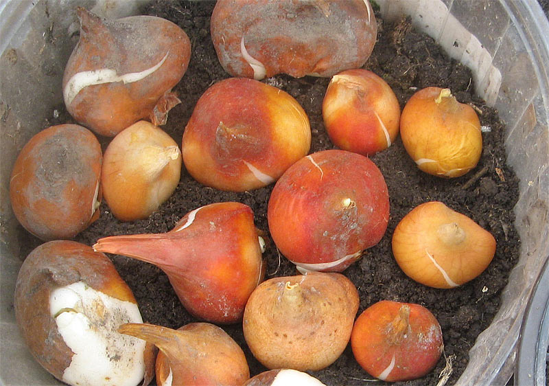 Nadat de tulpen zijn opgegraven, blijft de vraag open, hoe tulpenbollen na de bloei tot de herfst te bewaren? Opgesomde bollen worden opgeslagen in een ruimte die regelmatig moet worden geventileerd en zonlicht mag niet naar binnen komen. Om de tulpenbol tot de herfst met succes te behouden, is het belangrijk om het temperatuurregime te handhaven. Er mag geen luchtvochtigheid in de kamer zijn, anders verschijnen er schimmel en rot.