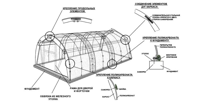 U bent misschien geïnteresseerd in:Polycarbonaat moet met pluggen op het frame worden geschroefd en het overtollige materiaal langs de randen worden afgesneden. Monteer de zijdelen op dezelfde manier. Gebruik lange horizontale banden om de twee kelderelementen te verbinden. Er moeten vijf van dergelijke verbindingen aan elke kant zijn. Maak na het aansluiten de behuizing.