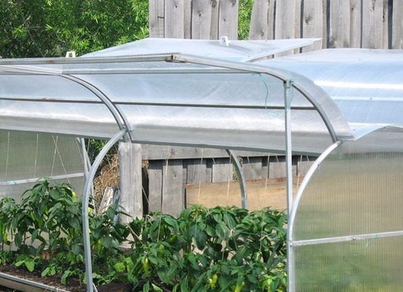 Het microklimaat in het gebouw wordt geregeld door de zijvleugel omhoog te brengen. Het deksel is bevestigd met scharnieren. In de buitenwijken zijn er modellen waarin u de vleugels volledig kunt openen. Om het deksel volledig te openen, zijn de scharniermechanismen van onderaf aan het frame bevestigd. Het frame is bovendien bevestigd met een houten balk. Er moeten verschillende sneden op worden gesneden. Een dergelijk mechanisme houdt de kasflappen in één positie. Ze zullen niet worden bedekt door wind of andere externe invloeden.