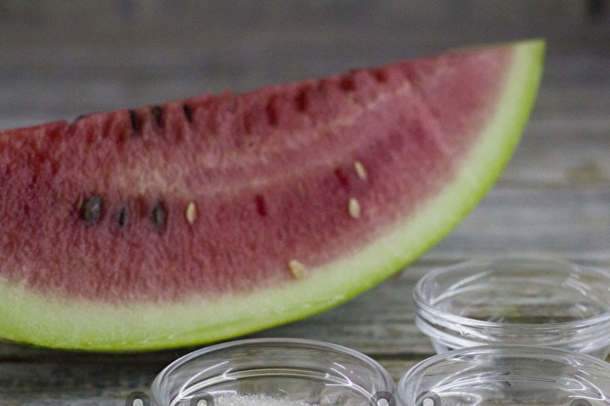 Om te beginnen selecteren we een rijpe elastische watermeloen, snijd ze in kleine stukjes van 2-3 cm, schil de zaden. Koop voor het zouten watermeloen van vertrouwde verkopers om ervoor te zorgen dat het fruit op een natuurlijke manier wordt geteeld zonder toevoeging van pesticiden en nitraten.