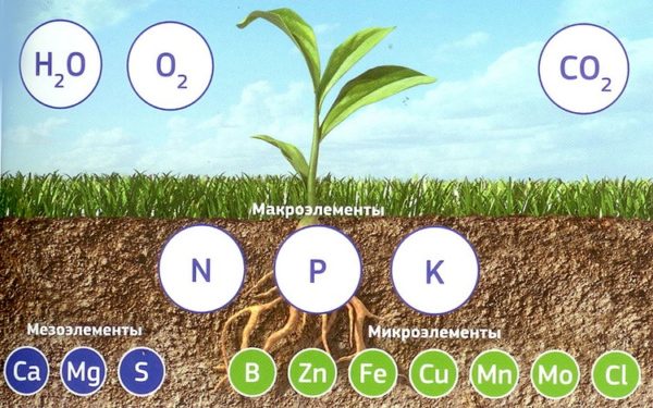 - Koper, dat de ademhaling en fotosynthese verbetert, is verantwoordelijk voor de vorming van voedingsstoffen en verhoogt de weerstand tegen negatieve omgevingsfactoren.
