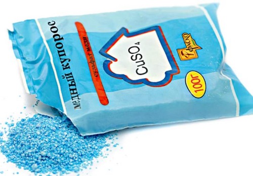 - kopersulfaat, kopersulfaat, dat eruit ziet als kristallen met een donkerblauwe kleur, is noodzakelijk om de biomassa van gebladerte te vergroten, de verwerking wordt uitgevoerd met een snelheid van 1 g per 1 m²;