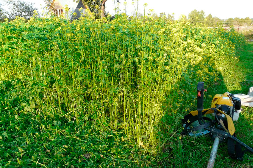 mosterd bevat stikstof, fosfor en vernietigt effectief late blight. Het doodt ook naaktslakken en plantschimmels die schadelijk zijn voor planten. Door zijn actieve groei is mosterd in staat om elke wiet te vernietigen en de grond te verrijken met voedingsstoffen. Als de aarde begint te logen, stopt deze plant het proces en houdt stikstof vast. Mosterd is veilig voor alle soorten tuingewassen (aardappelen, druiven, bomen, peulvruchten). Bij gebruik als mulch houdt het vocht in de grond vast en voorkomt het dat het bevriest.