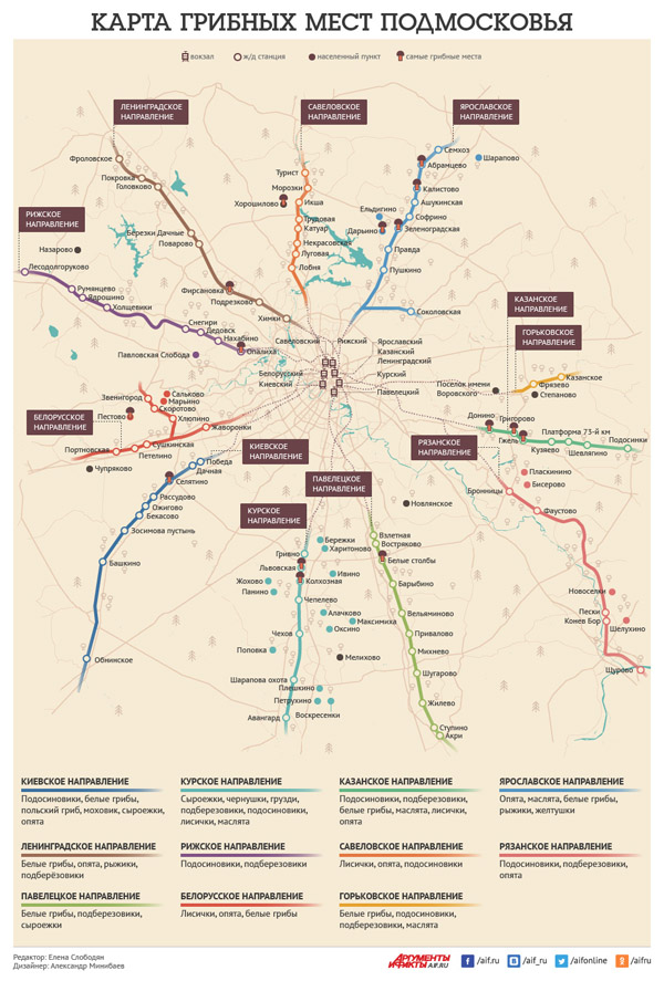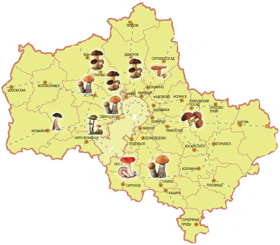 Elke richting van de Moskou-spoorweg heeft zijn eigen paddenstoelplaatsen, die worden aanbevolen door paddenstoelenplukkers. Hier is het onmiddellijk noodzakelijk om een reservering te maken dat het beter is om paddestoelen op een paar kilometer van de spoorweg of de snelweg te plukken, omdat deze producten actief verschillende schadelijke stoffen absorberen. Het is het beste om paddenstoelen op te pakken op een elektrische trein.