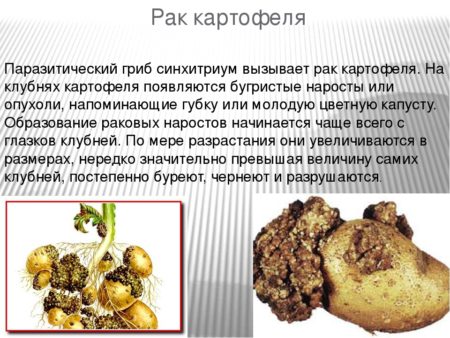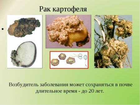 Bij het verbouwen van aardappelen worden veel zomerbewoners geconfronteerd met een ziekte zoals kanker. De schimmel infecteert de knollen, waardoor ze ongeschikt worden voor menselijke consumptie. De ziekte is in quarantaine geplaatst, het kan het gewas volledig vernietigen.