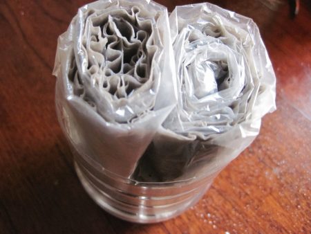 Sluit de bovenkant met nog een laag toiletpapier. We verpakken het met polyethyleen zodat het van bovenaf kan worden geïrrigeerd.