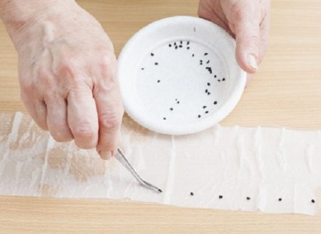 We bedekken de polyethyleen strips van 10 centimeter met toiletpapier, lichtjes bevochtigd met water uit het spuitpistool. Op een centimeter van de bovenkant van de film spreiden we de koolzaden 3 cm van elkaar.