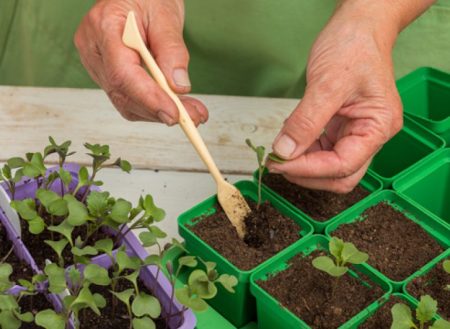 Bij het verplanten is het belangrijk dat de wortels in de grond blijven. Daarom kunnen ze niet van de ene container naar de andere worden geschud. Het is beter om het met een lepel te krijgen: dus een brok vochtige aarde met het minste verlies zal naar een nieuwe woonplaats verhuizen. Daar moet je van tevoren voor nieuwe planten zorgen: voor de scheuten moeten gaten in het oppervlak van de grond worden voorbereid. Daarin wordt de plant begraven aan de zaadlobbladeren. Na het verplanten wordt de aarde rond de zaailing verdicht.