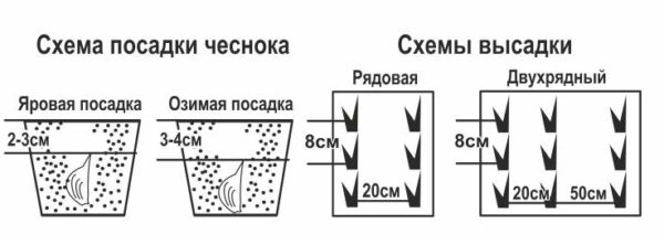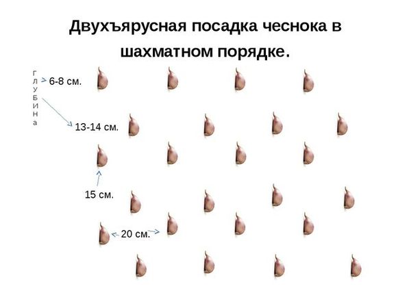 De tanden worden geplant in een greppel- of gatmethode, ze worden geplaatst op een diepte van 5 tot 7 cm. Landing wordt uitgevoerd op een afstand van 10 cm en er blijft een opening van minstens 2 cm over tussen de rijen. Er zijn interessante technologieën voor het landen in een dambordpatroon om ruimte te besparen (zie foto) ).