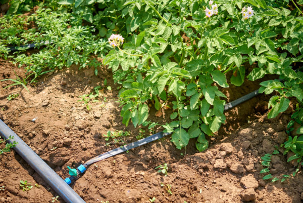 Geautomatiseerde druppelirrigatie is economisch en praktisch. Met het irrigatiesysteem kunt u het bodemvochtniveau normaal houden, maar de installaties zijn duur, daarom worden ze vaak alleen op grote boerderijen gebruikt. Irrigatie van aardappelen komt het dichtst bij de natuurlijke manier. Je kunt het na de bloei gebruiken om de luchtvochtigheid op het juiste niveau te houden.