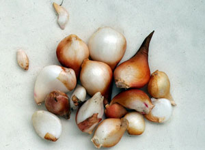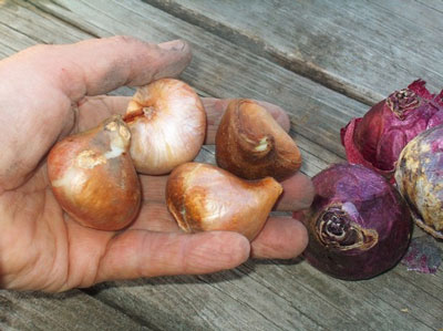 Voordat u de bollen uitgraaft, moeten gedroogde bloemstengels en bladeren voorzichtig worden afgebroken of worden gesneden met tuinscharen. Bij het uitvoeren van dit werk is het belangrijkste om de bodem niet te kwetsen. De bol moet worden bevrijd van bruine schubben, grondig worden gewassen in een oplossing bereid van vooraf bereid kaliumpermanganaat, in dozen in één laag worden geplaatst. Het is verplicht om het ras van het ras te scheiden en om niet in de war te raken is het beter om te tekenen. Het is noodzakelijk om af te wijzen, alleen groot en pijnloos plantmateriaal achter te laten.