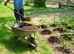 Granulaire paardenmest wordt binnengebracht voor het graven en onmiddellijk ingebed in de grond, dit wordt elk jaar gedaan.