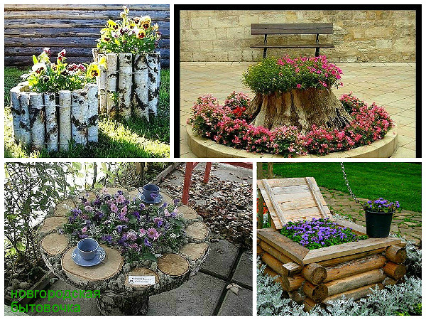 De meest originele zijn bloembedden van autobanden. Zomerbewoners snijden zwanen, rijtuigen van hen uit en planten hun bloemen erin. Velen snijden een band in de vorm van een bloemknop.