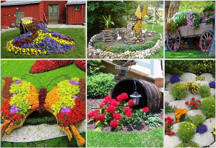 Onnodige geïmproviseerde middelen, sanitair, oude ketels of laarzen zijn geschikt voor het maken van decoraties voor bloembedden. Het belangrijkste is om ze op de juiste plaats te plaatsen en ze mooi te schilderen. Het oude toilet bijvoorbeeld, we schilderen in felle kleuren en gieten er aarde in, en dan planten we bloemen. We plaatsen twee of drie toiletten en voegen er tanks aan toe, die ook niet nodig zijn. Aldus wordt een tamelijk interessante compositie verkregen.